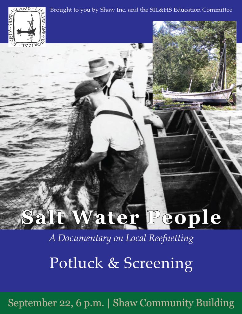 Salt Water People (approx. 30 minutes) is a rare and intimate glimpse into reefnet fishing—the ancient method of catching salmon using nets stretched between anchored wooden boats with towers. Though rooted in traditions of the Lummi people, this practice was adopted and carried on in the San Juan Islands, including by many residents of Shaw Island, who are featured prominently throughout the film. The documentary shares powerful scenes: a venerable tribal elder recounts legend and lore around reefnetting, longtime local reefnetters—including Shaw Islanders—are shown setting gear, and a young Shaw Island couple even operates netting right off their beachfront home.